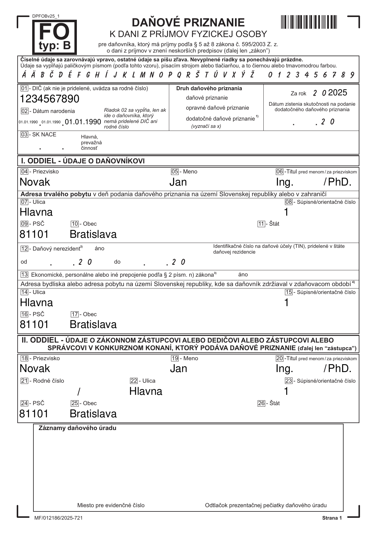 Reálna ukážka vyplneného PDF (fiktívne údaje).